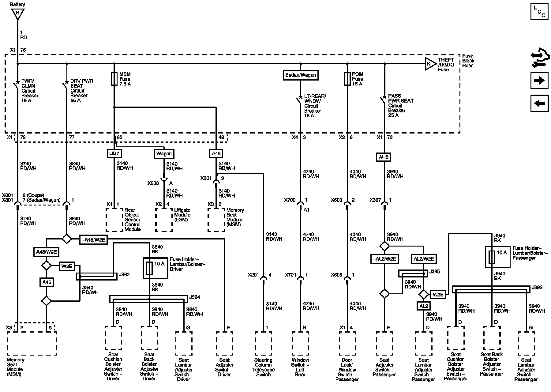 MSM, PDM Fuses, and DRV PWR SEAT, LT/REAR/WNDW, PASS PWR SEAT, PWR CLMN Circuit Breakers