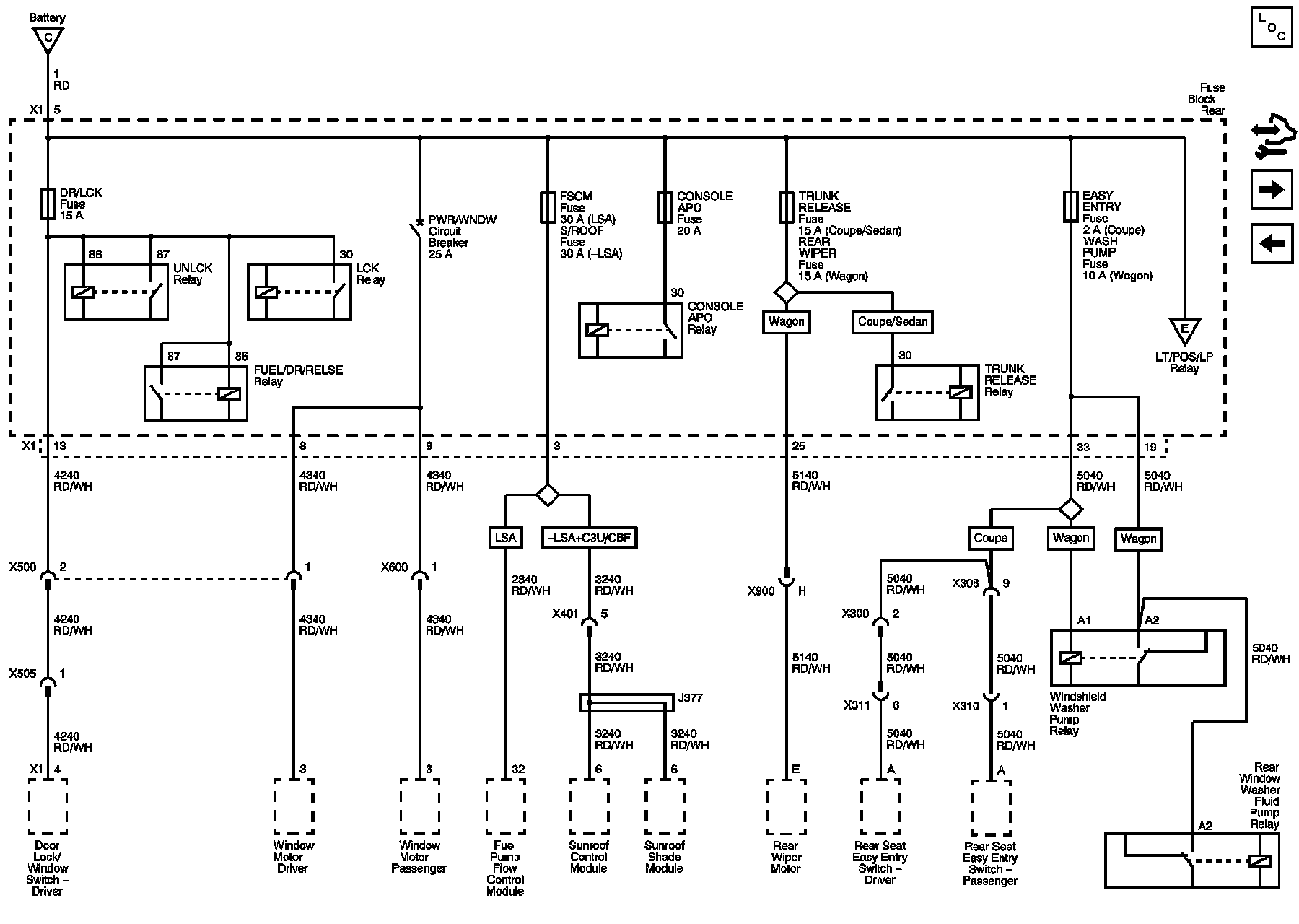 CONSOLE APO, DR/LCK, EASY ENTRY, FSCM, REAR WIPER, S/ROOF, TRUNK RELEASE, WASH PUMP Fuses, and PWR/WNDW Circuit Breaker