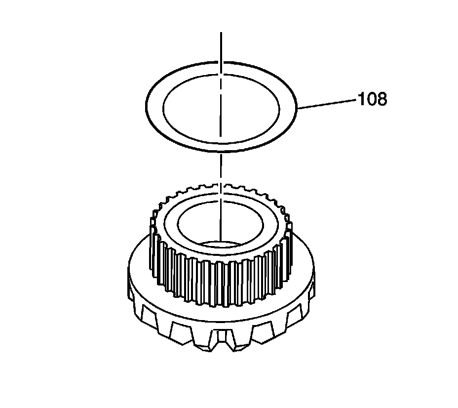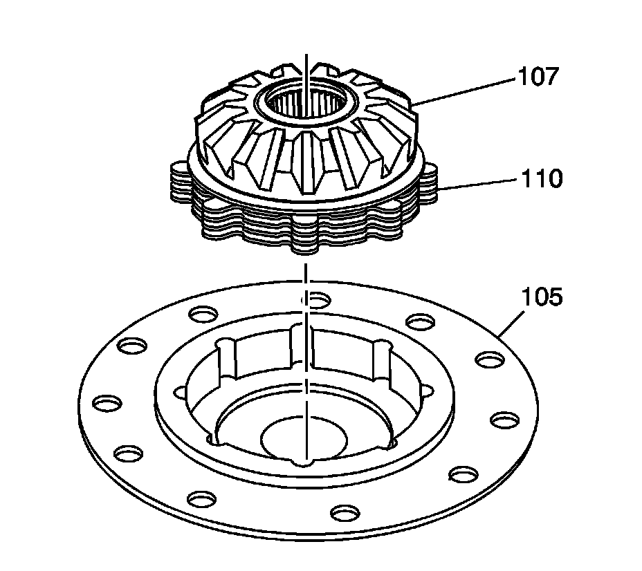 1. Install the clutch disc thrust washers (108) on the pinion side gears with the bevel facing out.