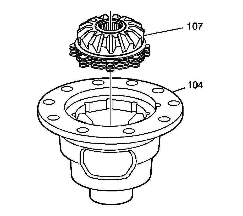 5. Install the assembled axle side gear (107) into the left differential case half (104).
