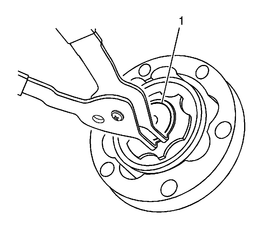 5. Using a pair of snap ring pliers, install the new retaining ring (1) for the CV joint.