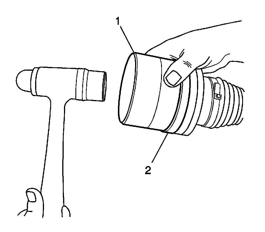 16. Using the J 38734 - compressor (1) and a hammer, install the NEW CV joint cap (2).