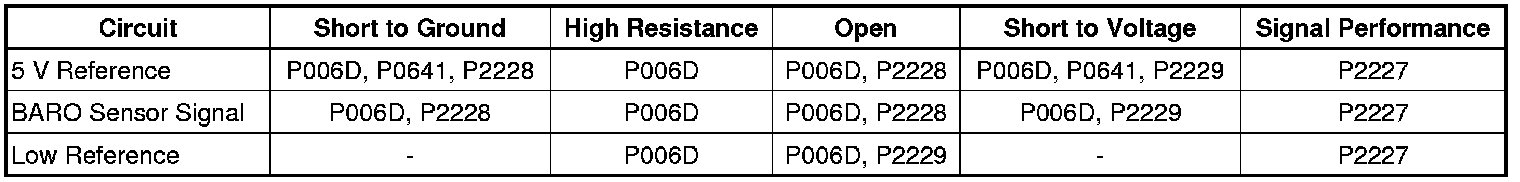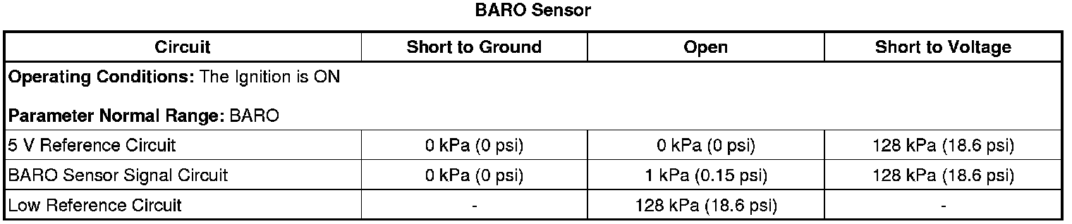 The ECM detects that the BARO sensor signal is less than 51 kPa (7.4 psi) for 1 s.