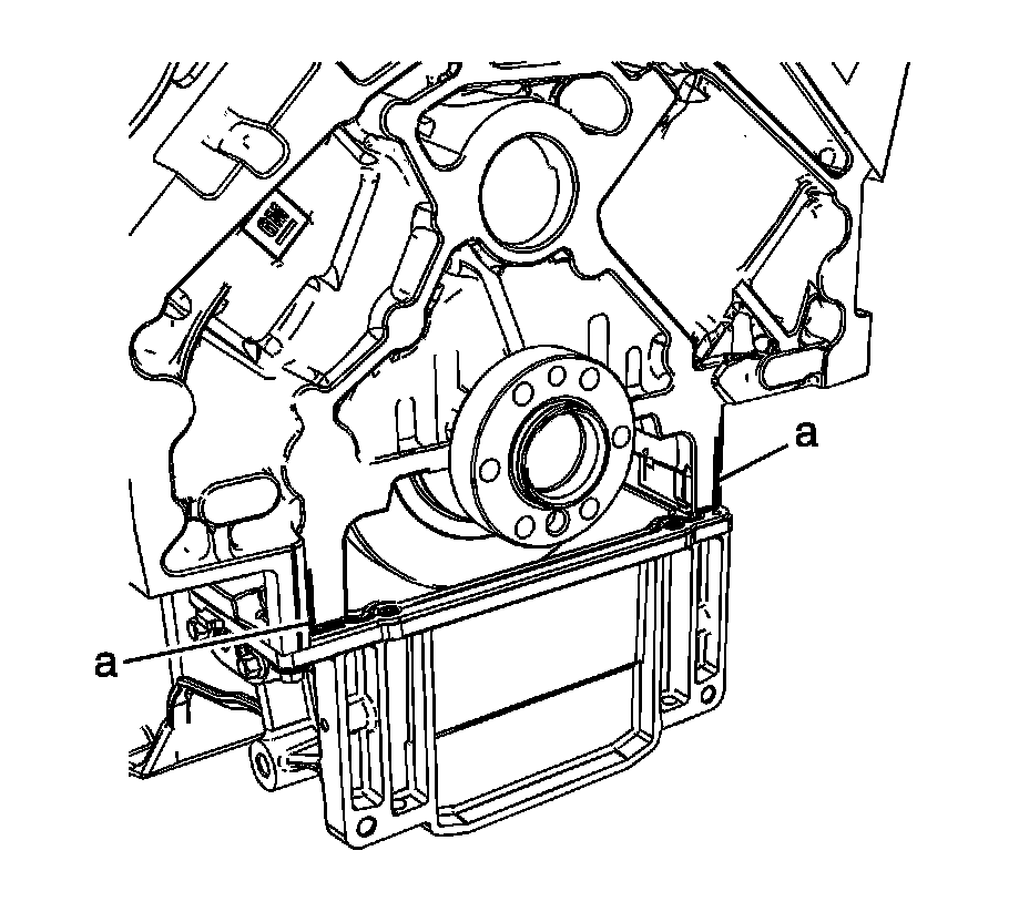 1. Apply a 5 mm (0.2 in) bead of sealant, 20 mm (0.8 in) to the 2 joints (a) at the rear of the block/pan. Refer to Adhesives, Fluids, Lubricants, and Sealers Adhesives, Fluids, Lubricants, and Sealers.