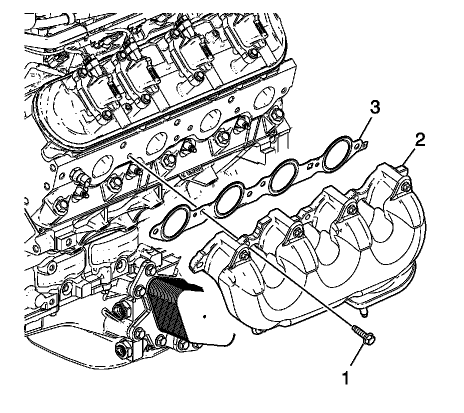 4. Install the exhaust manifold (2), NEW gasket (3), and bolts (1).