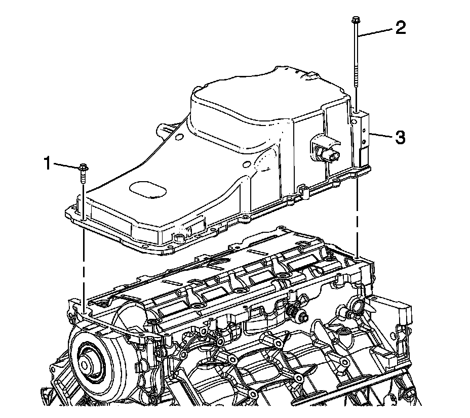 2. Install the oil pan bolts (1, 2) to the pan and through the gasket.