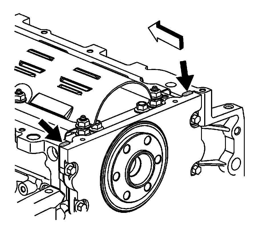 2. Apply a 5 mm (0.2 in) bead of sealant GM P/N 12378521 (Canadian P/N 88901148), or equivalent, 20 mm (0.8 in) long to the engine block. Apply the sealant directly onto the tabs of the rear housing gasket that protrude into the oil pan surface.