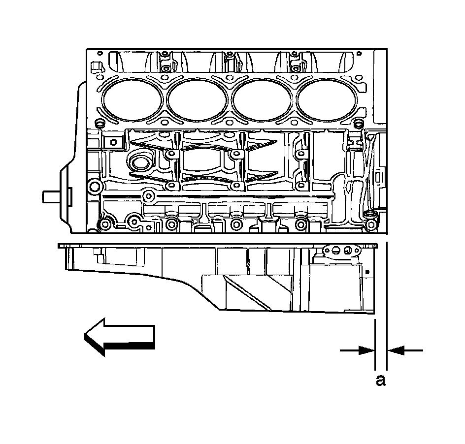 2. Insert a feeler gauge between the straight edge and the oil pan transmission housing mounting surface. The rear of oil pan must be flush with the rear face of block or no greater than 0.5 mm (0.02 in) below flush (a).