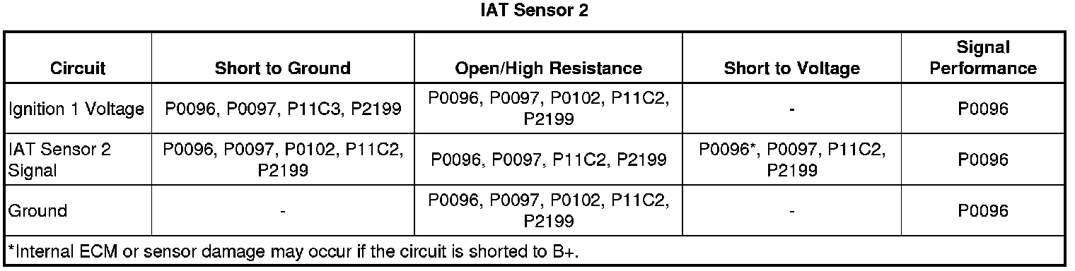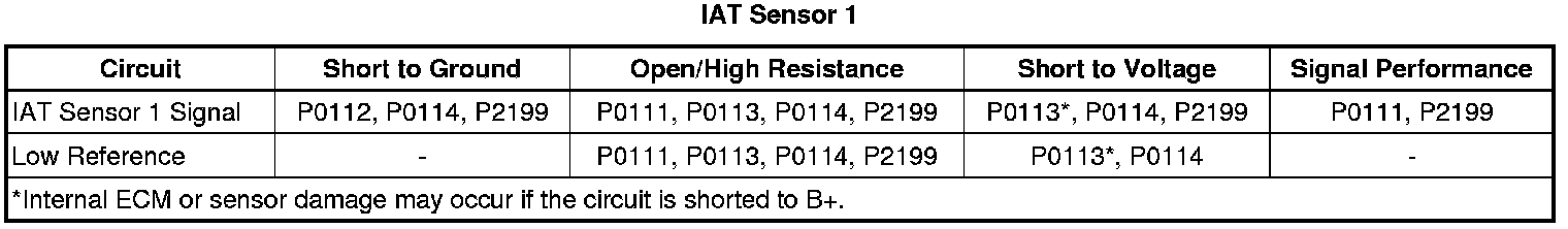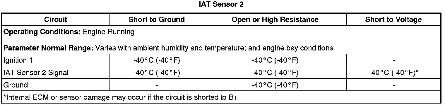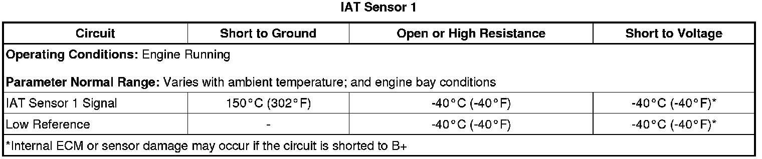 * Depending on the ambient temperature, an IAT sensor 1 signal circuit that is shorted to the MAF sensor signal circuit can cause either a rapid fluctuation in the IAT Sensor 1 parameter or cause it to become stuck at a given value.