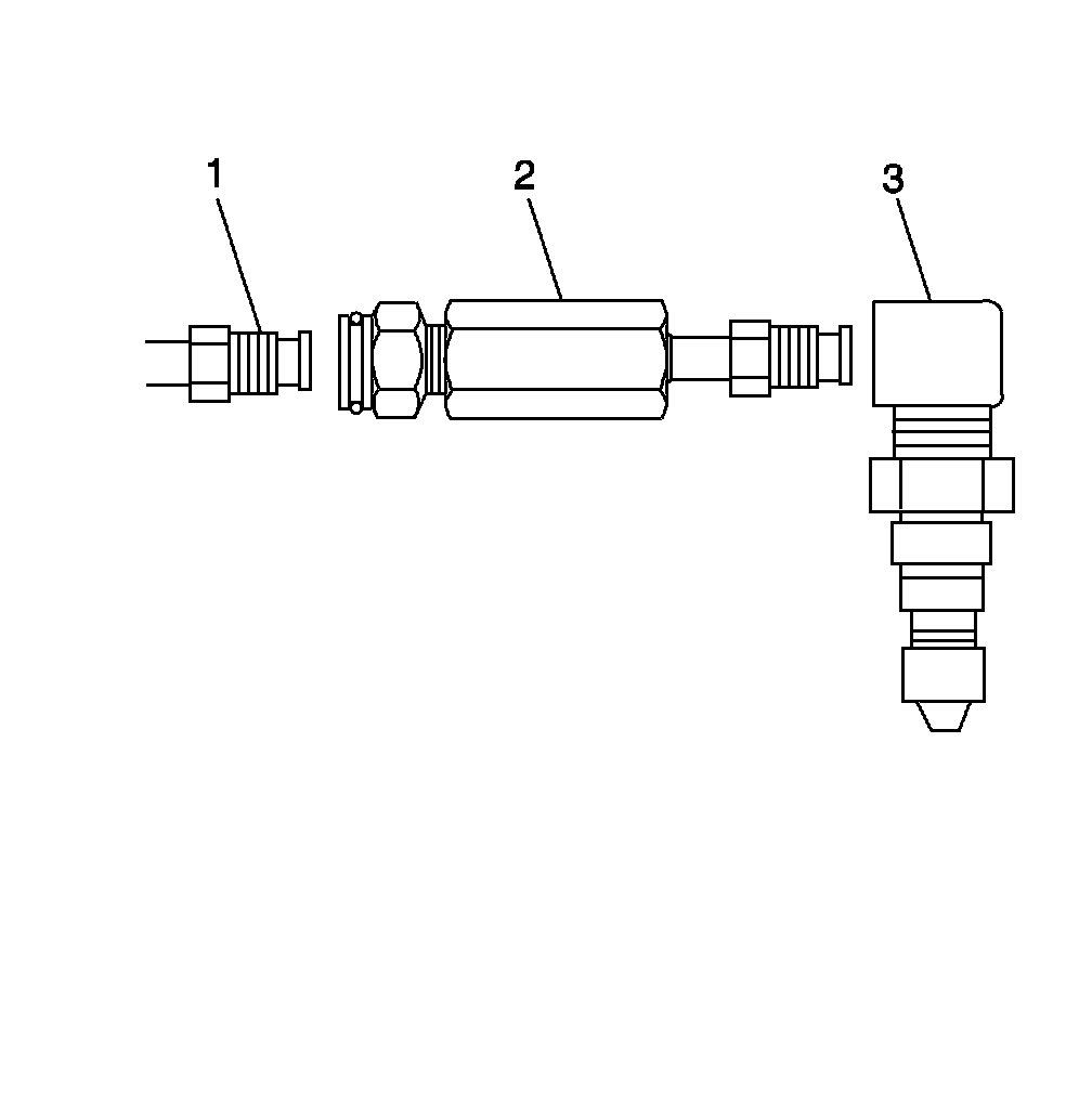 4. Connect the black supply hose (3) to DT 45096-21 - adapter (1) and DT 35944-200A - adapter (2) connected to the feed line. The clear waste hose and black supply hose are now connected in the normal flow direction.