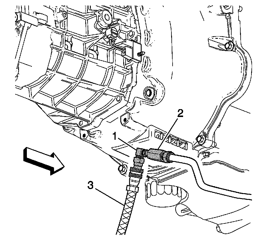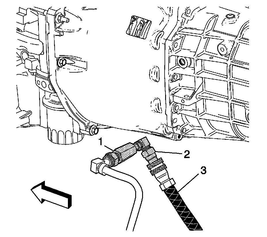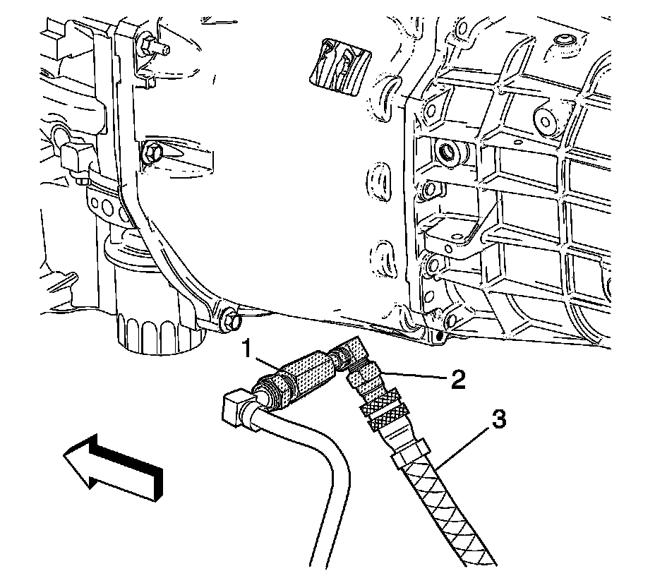 1. Connect the DT 45096-21 - adapter (3) and DT 35944-200A - adapter (2) to the vehicle transmission oil cooler supply and return lines (1) at the transmission.