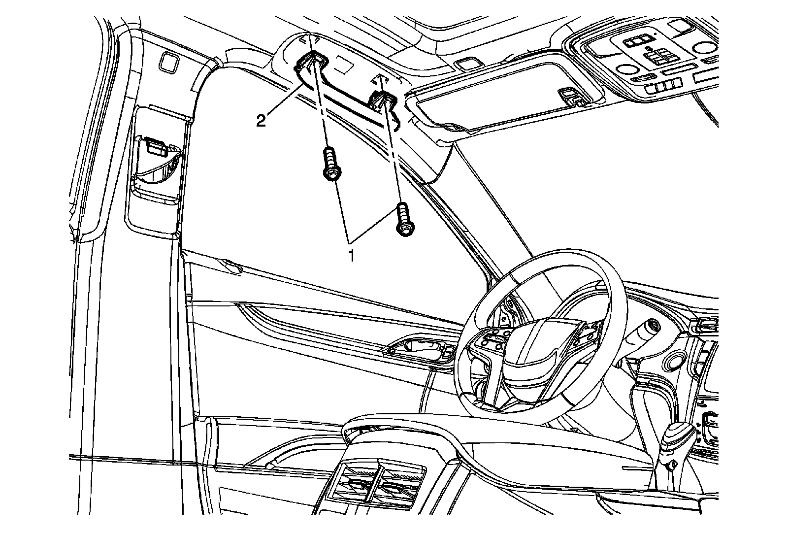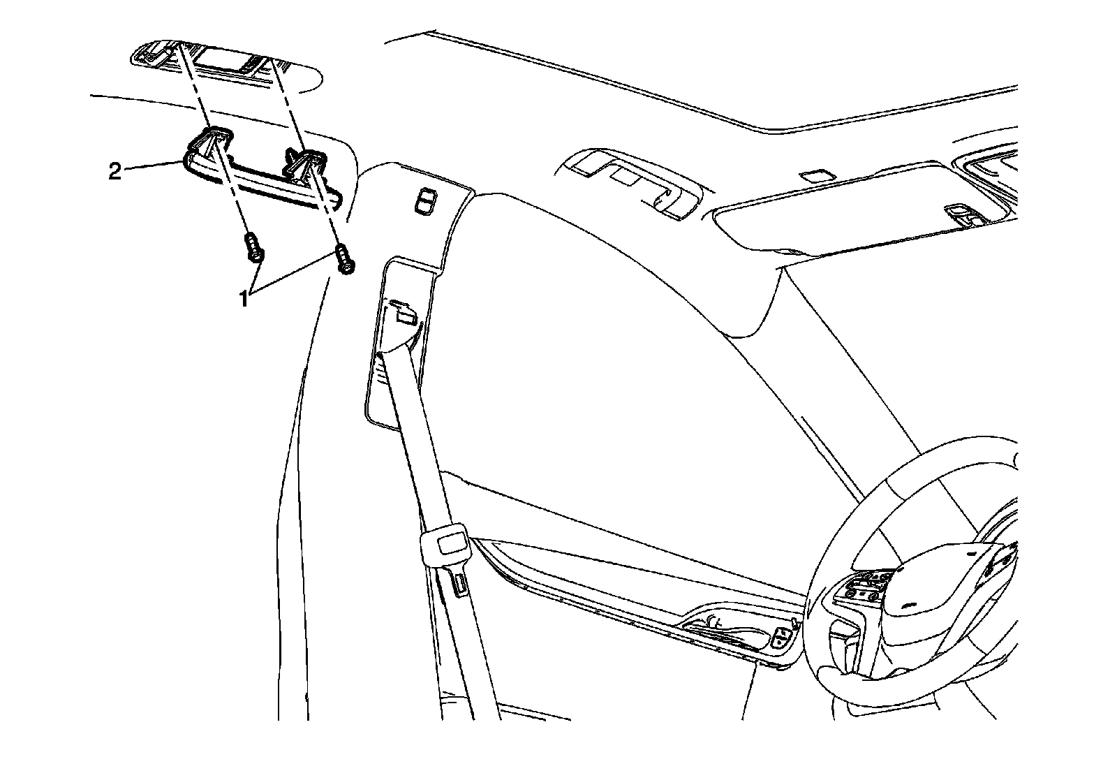 4. Remove the roof rail front assist handle assembly (2). Refer to Roof Rail Front Assist Handle Replacement Roof Rail Front Assist Handle Replacement.