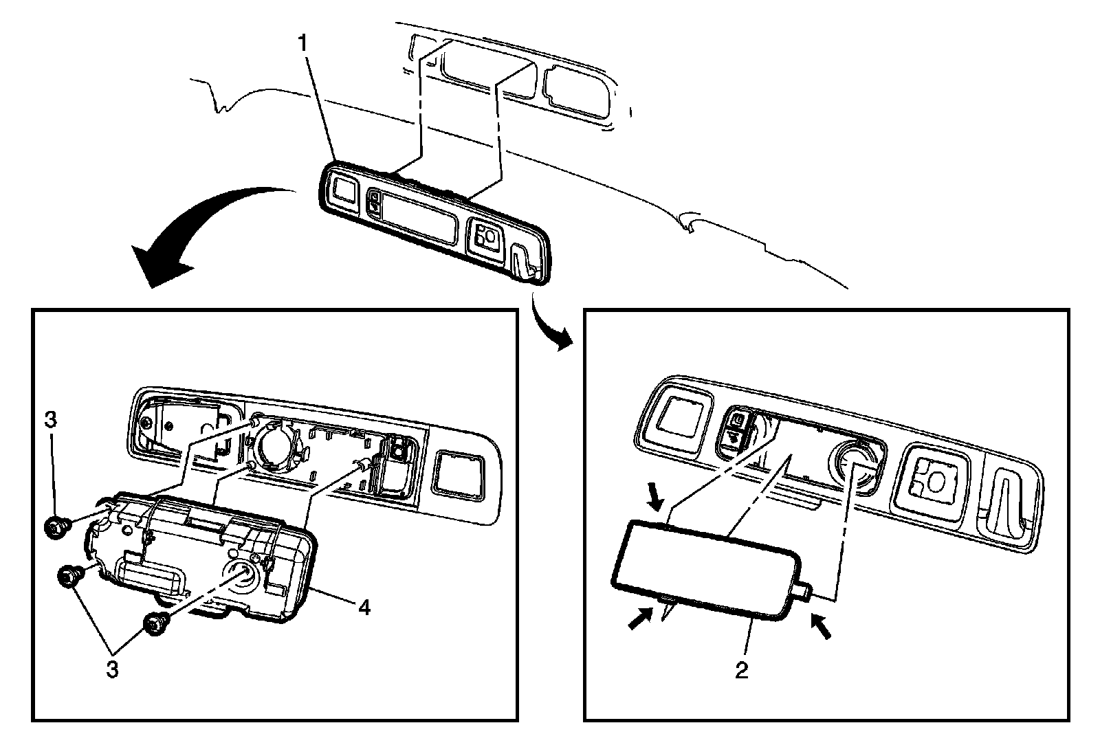 7. Remove the roof console assembly (1). Refer to Roof Console Replacement Roof Console Replacement.