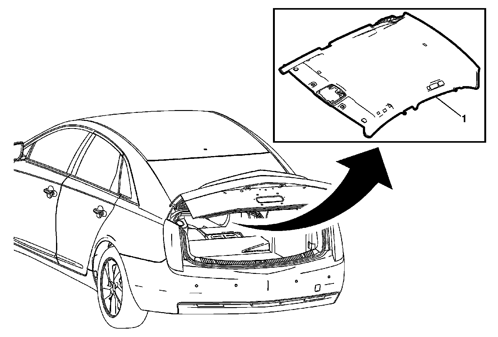 1. With the aid of an assistant, position the headliner trim panel assembly (1) into the vehicle through the rear compartment.