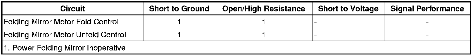 The mirror select and fold/unfold switches are inputs to the mirror control module which communicates with the memory seat module through a serial data circuit. When the memory seat module receives a fold/unfold signal from the mirror control module, the memory seat control module will send a fold or unfold command back to the left mirror control module and passenger window switch. The mirror control module and passenger window switch control the fold/unfold motors through bi-directional control circuits.
