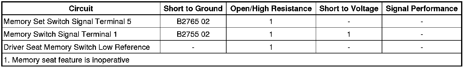 Low reference is supplied to the driver seat memory switch from the seat memory control module. When a memory switch is pressed, the signal circuit from the seat memory control module is pulled low through the switch contacts and series of resistors indicating the memory recall request. In response to this signal, the seat memory control module commands the appropriate seat motors to move to the pre-recorded seat positions stored in memory.