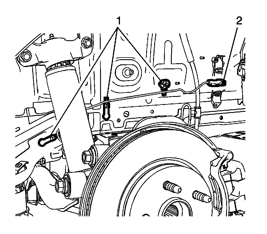 10. Release the wheel speed sensor harness electrical connector (2) from the harness bracket.