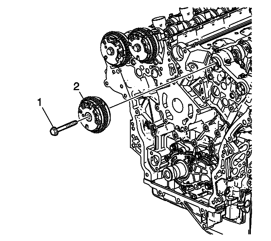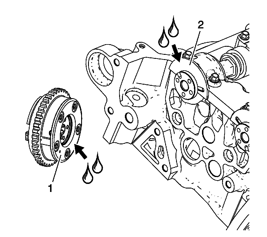 6. Apply a liberal amount of lubricant to the back of the camshaft position actuator (1) and front of the camshaft bearing cap (2). Refer to Adhesives, Fluids, Lubricants, and Sealers Adhesives, Fluids, Lubricants, and Sealers for recommended lubricant.