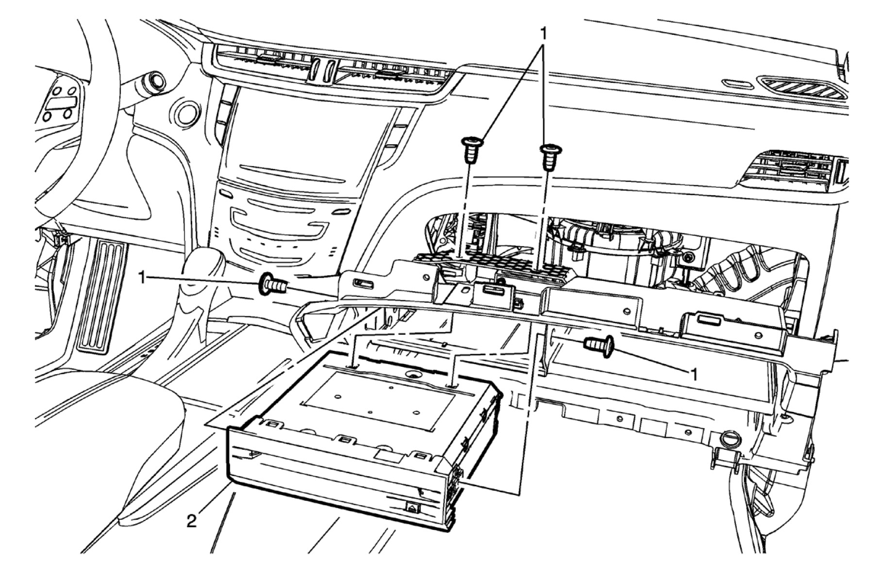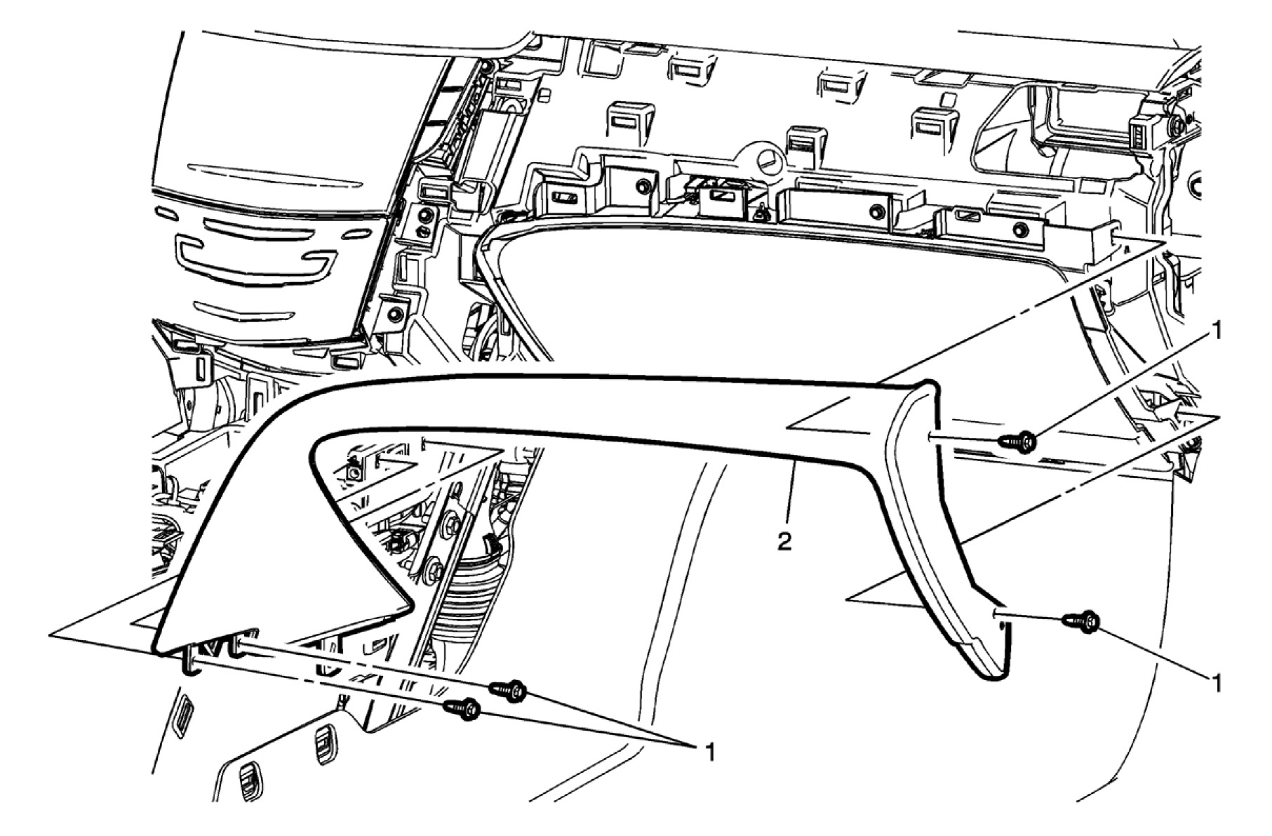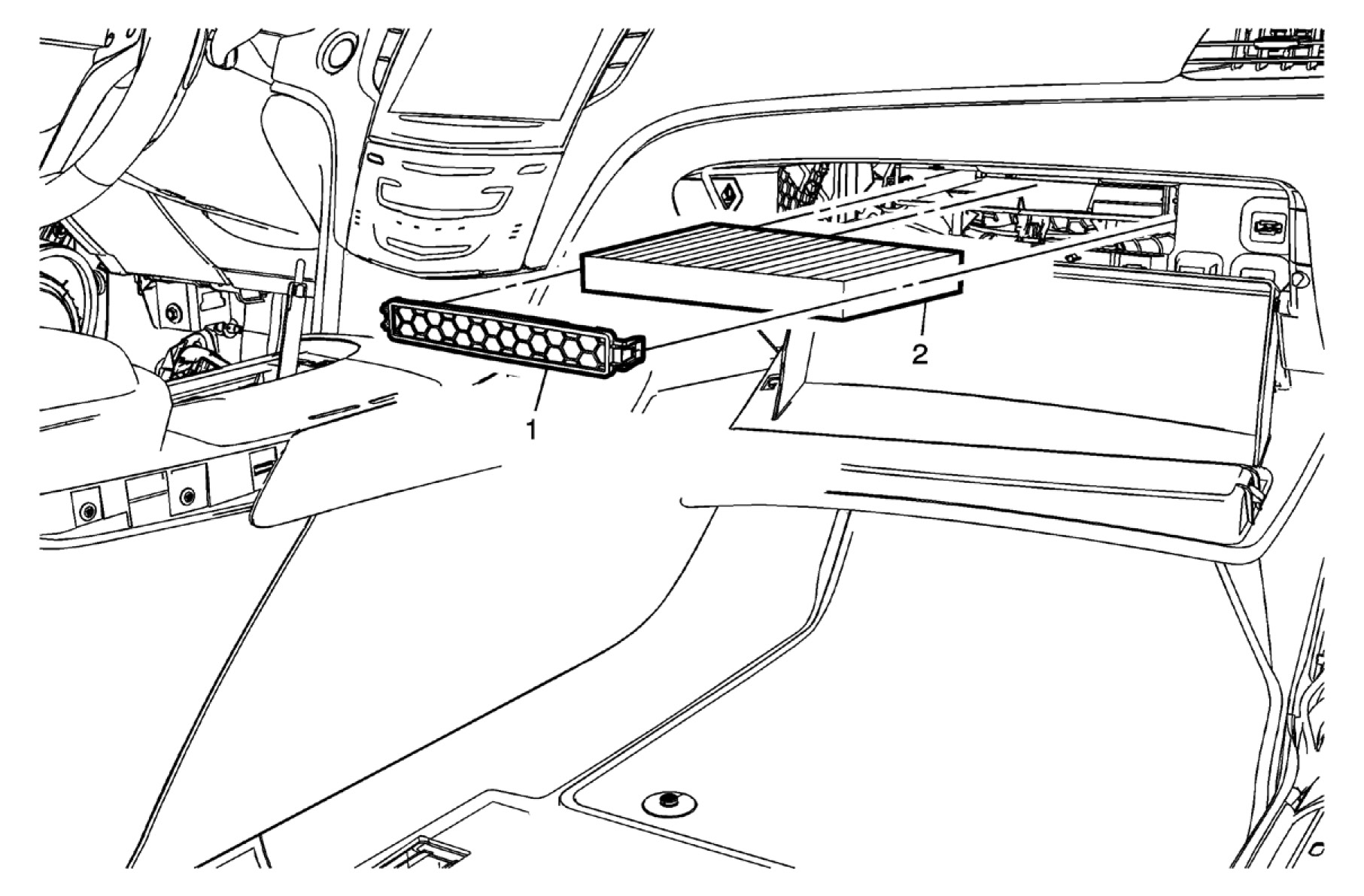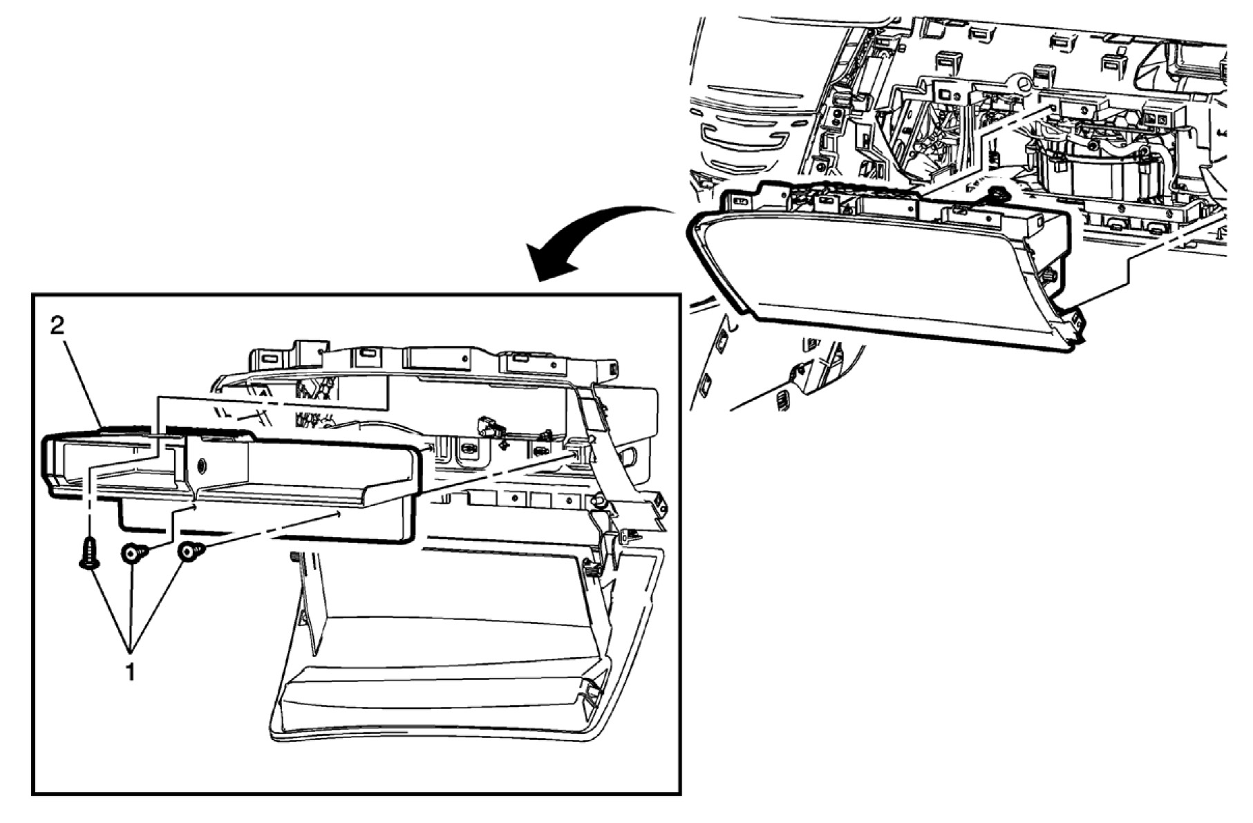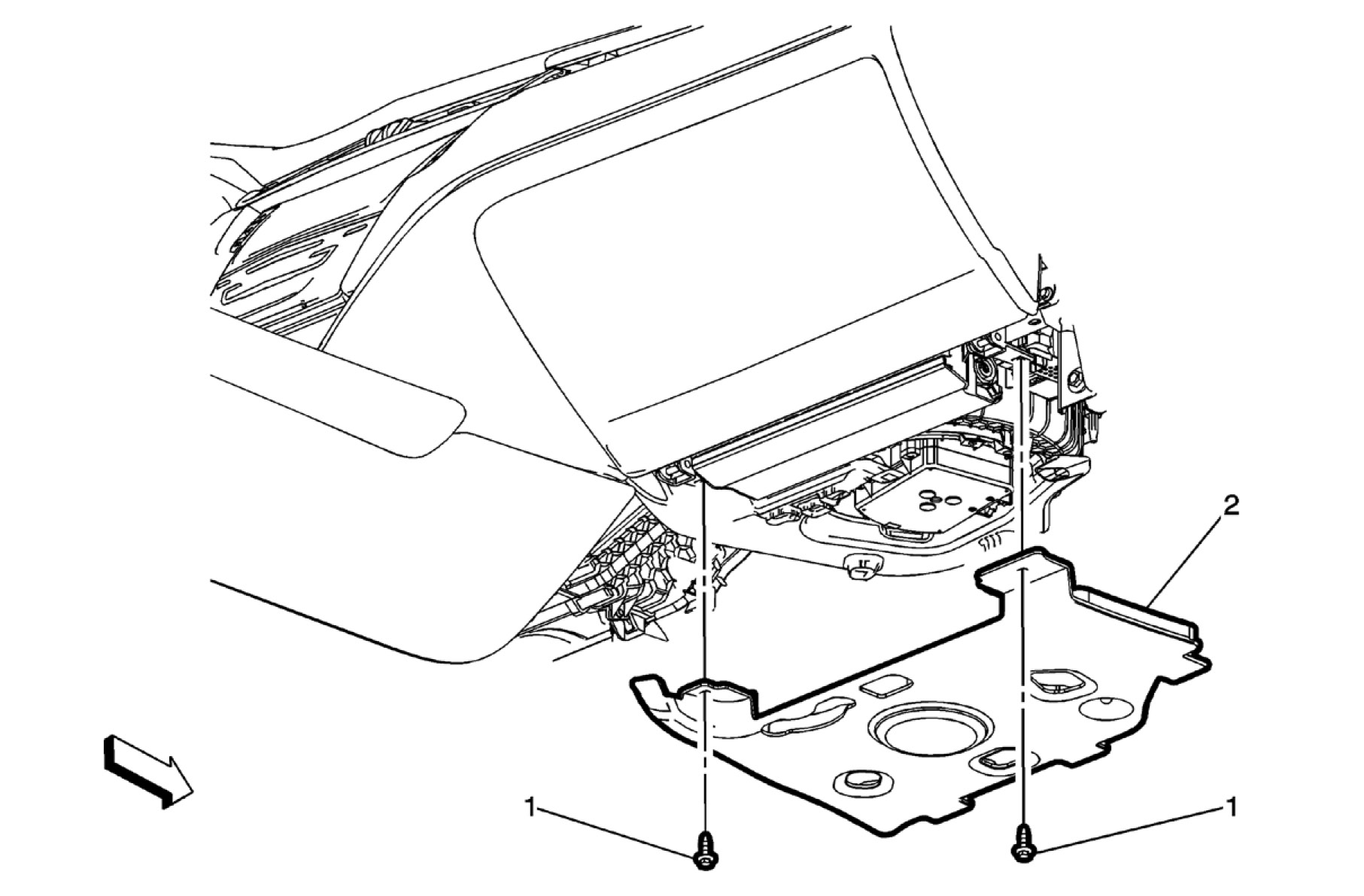 6. Swing the door (2) down to access the fasteners on the bottom of the instrument panel compartment.