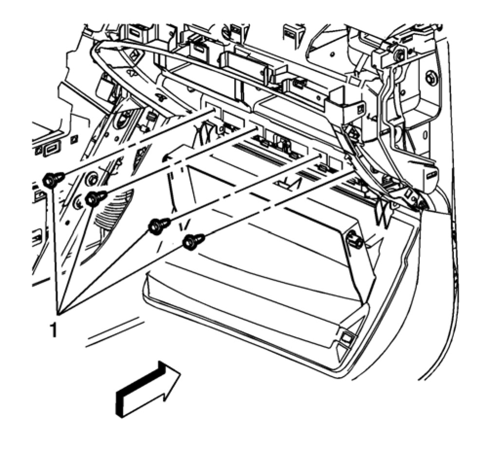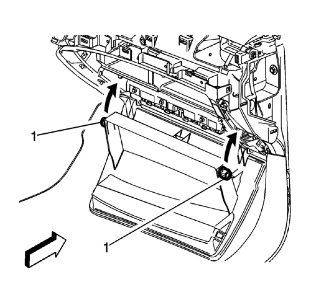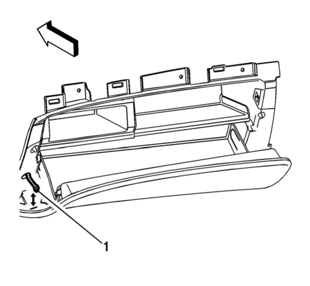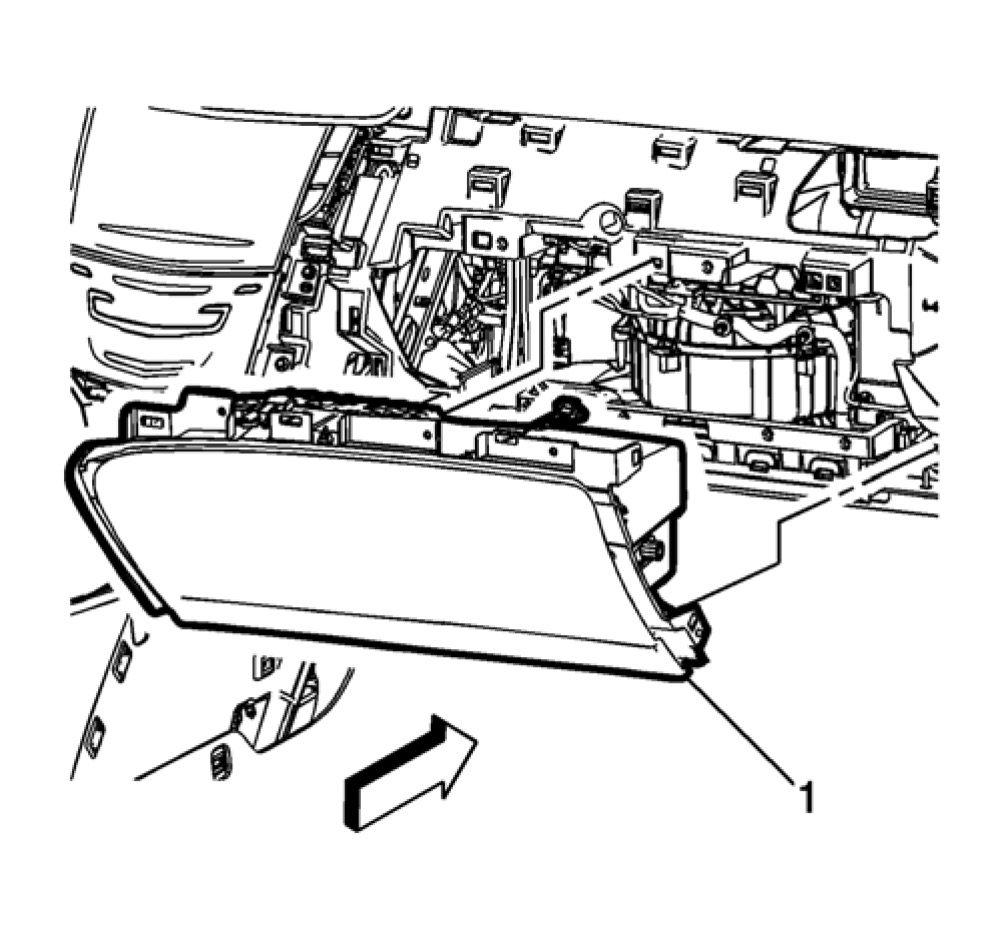8. Remove the instrument panel compartment (1) secured by retainers to the instrument carrier.