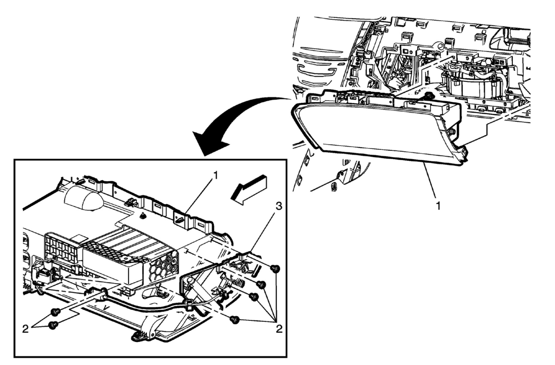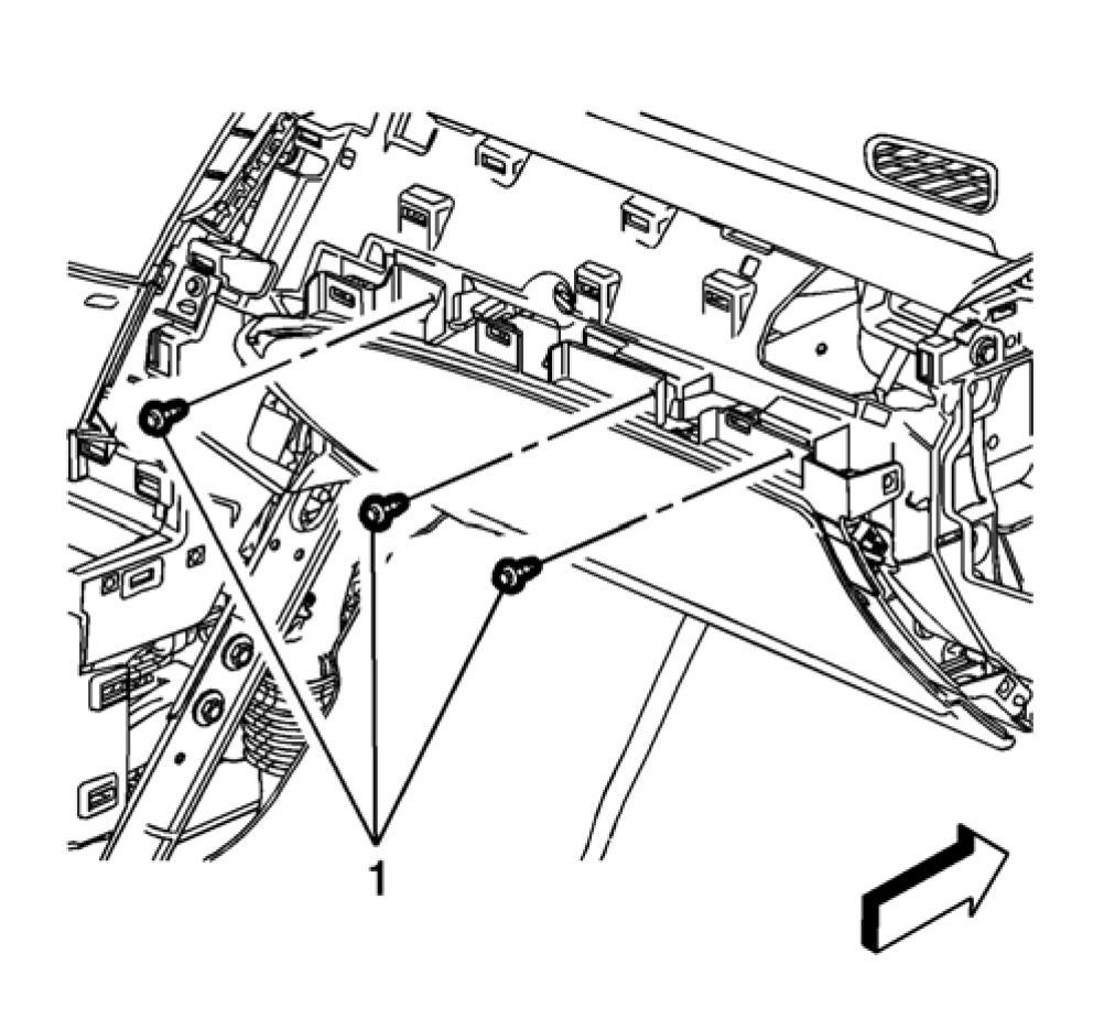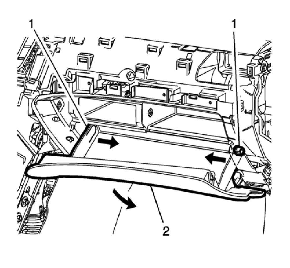 8. Remove the instrument panel compartment (1) secured by retainers to the instrument carrier.