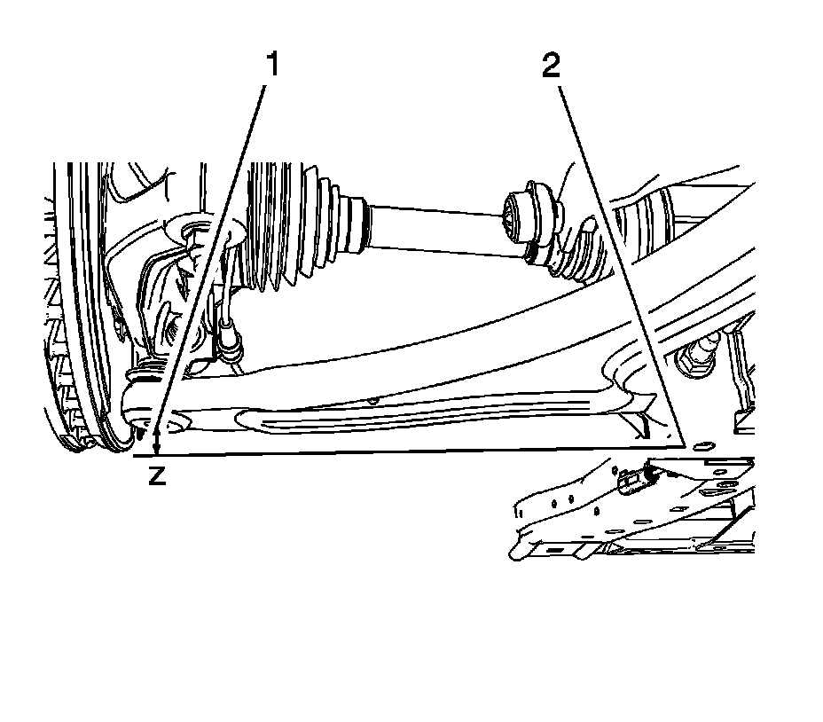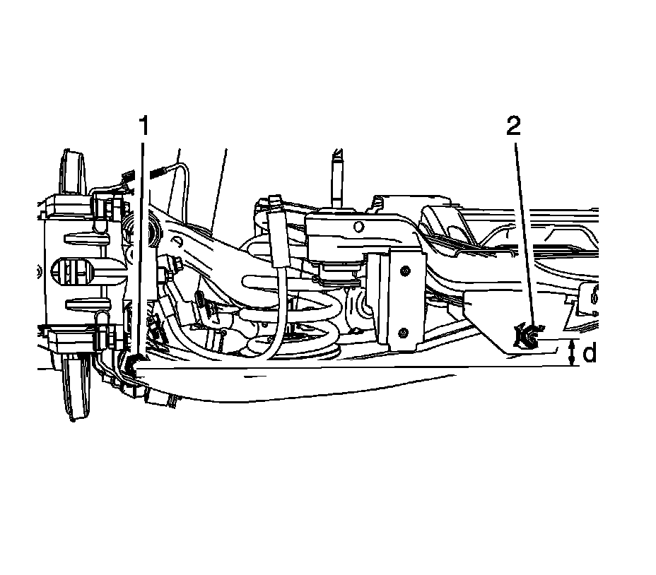 D Height GNC: The vertical distance between the center of the outer lower control arm bolt (1) to the center of the inner lower control arm bolt (2).