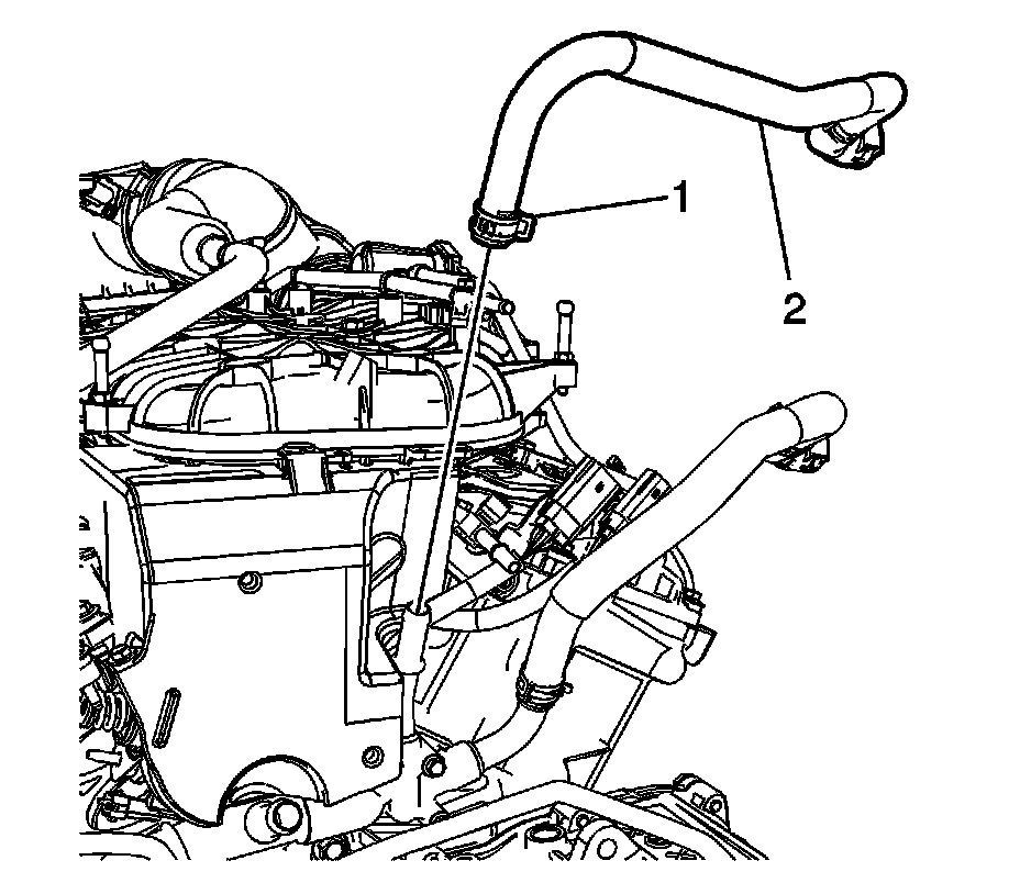 5. Release the clip from the quick disconnect (1) and remove the heater outlet hose (2) from the heater core tube.