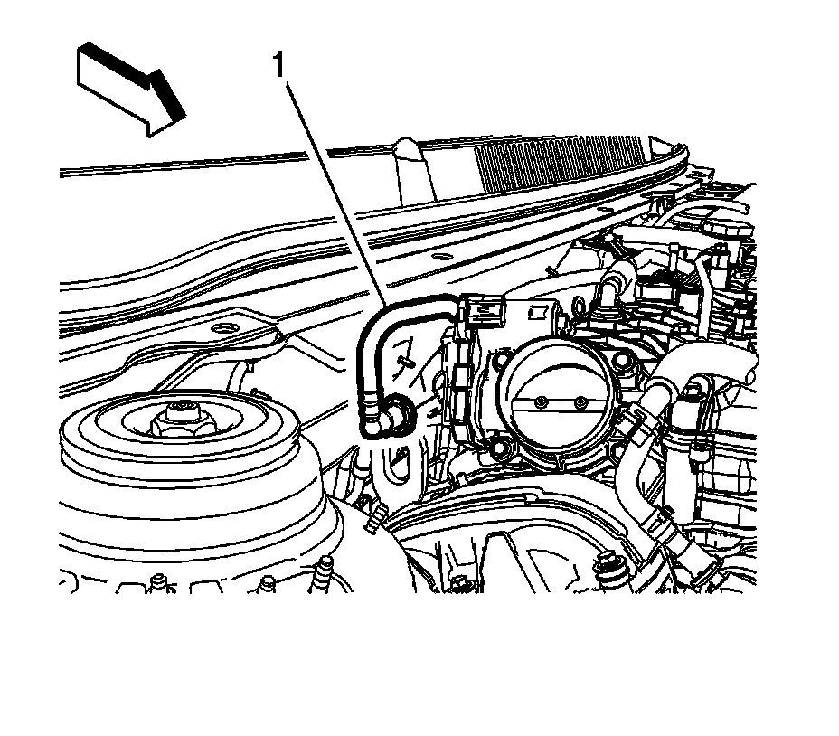 2. Disconnect the EVAP emission front pipe (1) from the EVAP purge solenoid valve. Refer to Plastic Collar Quick Connect Fitting Service Plastic Collar Quick Connect Fitting Service.