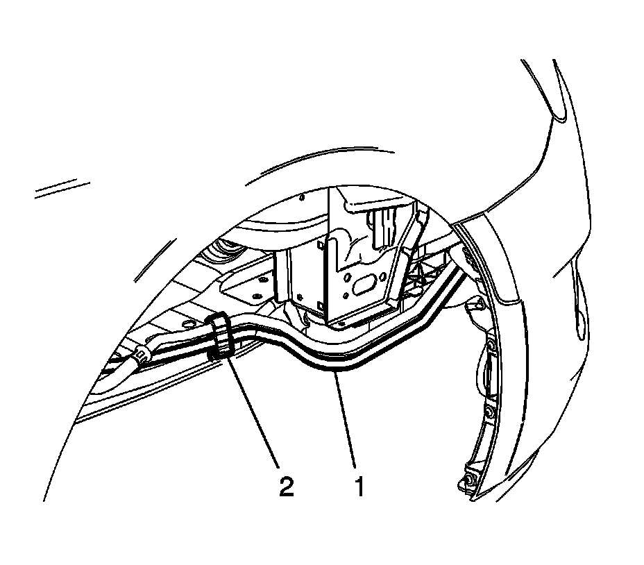 7. Secure the power steering gear outlet hose (1) in the plastic clip (2).