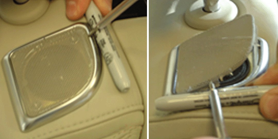 1. Insert a pick into the speaker hole at the rear of the grille towards the center of the seat. Pry up the grille at the front then move towards the outboard side of the grille. Use a small prying object under the pick so not to damage the speaker bezel.