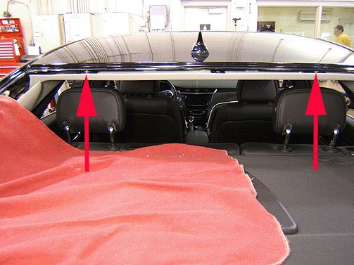 1. Using your fingers or a hooked trim stick (with 90 degree bend), pull down on the rear edge of the headliner at the centerline of the vehicle.