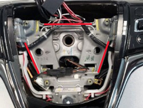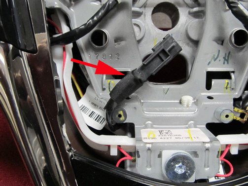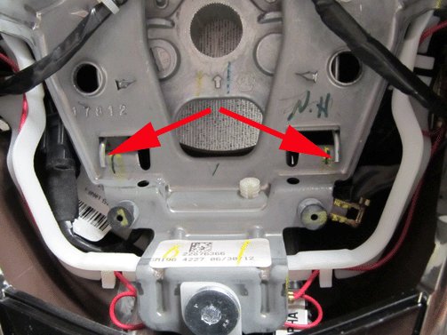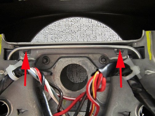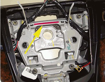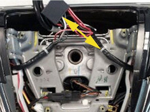 - If you see a RED or BLACK line under the airbag retention spring between the left and right branches of the main wire harness, the steering wheel has already been reworked. No further rework is required. Inspect the wiring and ensure there is no damage to wires and reposition the heated steering wheel wire harness as shown in UVD step # 5. Reinstall the airbag module into the steering wheel.