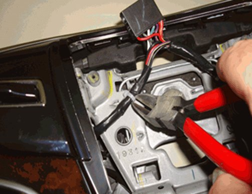 2. Most steering wheels will have the heated steering wheel wiring harness attached to the horn plate with a clip. If the vehicle does not have this clip, proceed to step 3. Using side cutters, snip off and remove the white retaining clip that currently holds the heater connector to the horn plate. Leave the lower portion of the white retaining clip connected to the horn plate. This prevents any loose pieces of the white retaining clip from falling into the wheel and causing rattles while driving.