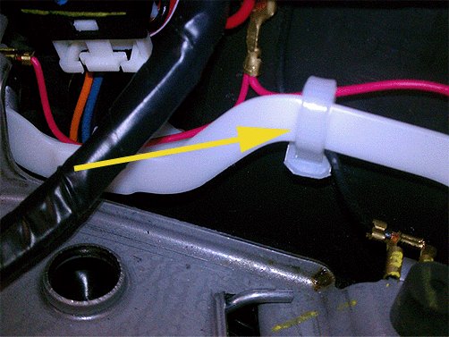 4. Cut the white wire tie that retains the incorrect length wire harness to the horn plate. It is not necessary to remove both clips for this step if one side has an acceptable length. Use care to not damage the harness.