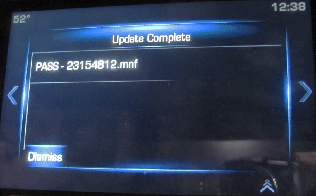 Update Complete screen for CUE system equipped with navigation system shown. Update Complete screen for CUE system without navigation is similar.