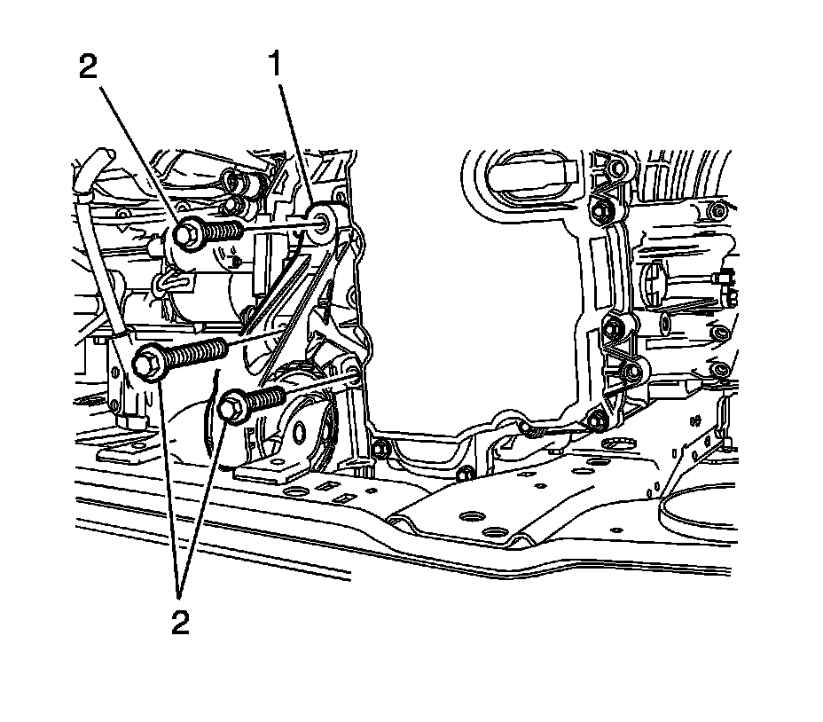 2. Install the NEW transaxle mount bolts (2) and tighten to 62 Nm (46 lb ft).