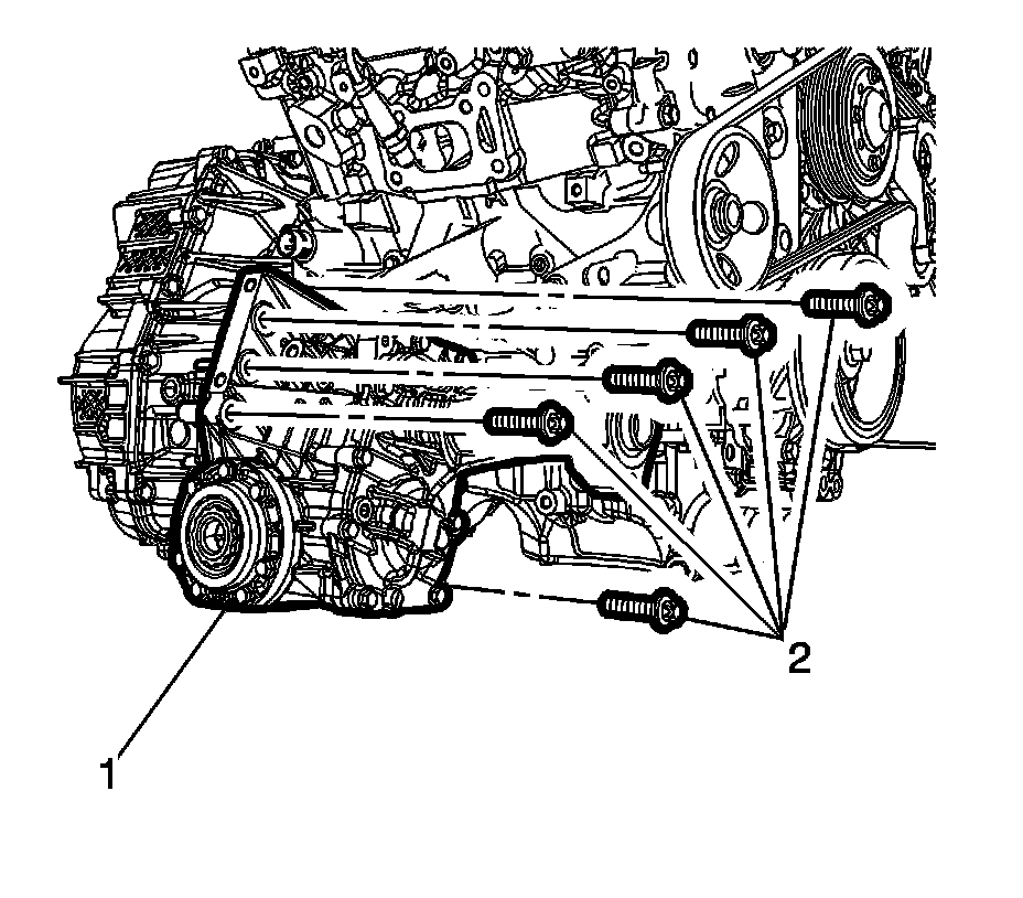 6. Install the transfer case-to-transmission bolts (2) and tighten to 100 Nm (74 lb ft) plus 60 degrees plus 15 degrees.