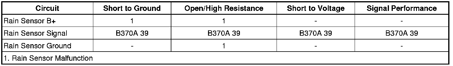 B+ voltage is supplied to the Rain Sensor. Whenever the ignition is ON, or accessory positions, the body control module (BCM), sends the turn signal/multifunction switch status by using a pulse width modulated (PWM) signal. When a wipe cycle is needed, the Rain Sensor sends a PWM voltage signal to the BCM, requesting the wiper operation. The BCM commands the Windshield Wiper Motor wipe cycles. If at anytime a fault occurs between the Rain Sensor and BCM, the BCM will use the inputs from the turn signal/multifunction switch in the delay positions to operate the Windshield Wiper Motor at continuous variable delay intervals.