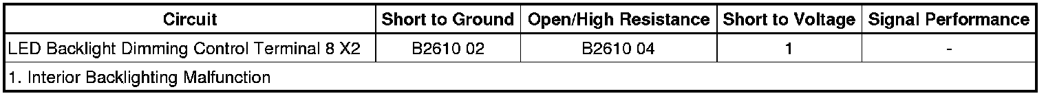 The BCM detects an open/high resistance in the LED backlight dimming control circuit terminal 8 X2.