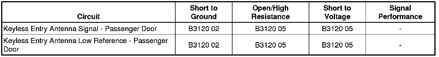 The Keyless Entry Control Module detects a short to B+ or an open on the passenger front door keyless entry antenna signal circuit.