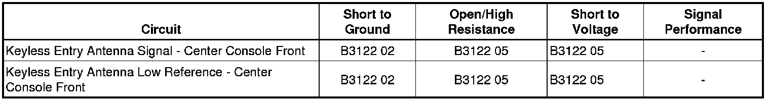 The Keyless Entry Control Module detects a short to B+ or an open on the front center console keyless entry antenna signal circuit.
