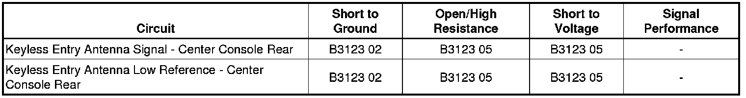 The Keyless Entry Control Module detects a short to B+ or an open on the rear center console keyless entry antenna signal circuit.