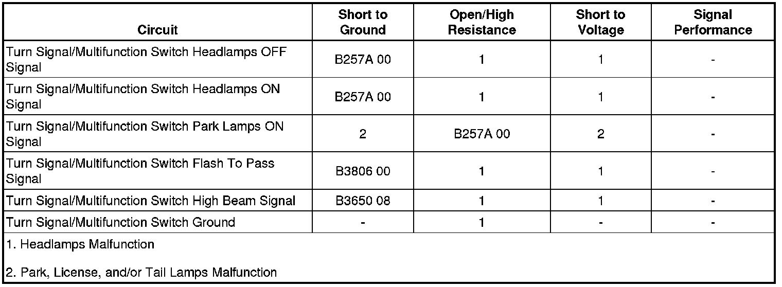 The BCM detects a short to ground in the turn signal/multifunction switch high beam signal circuit.