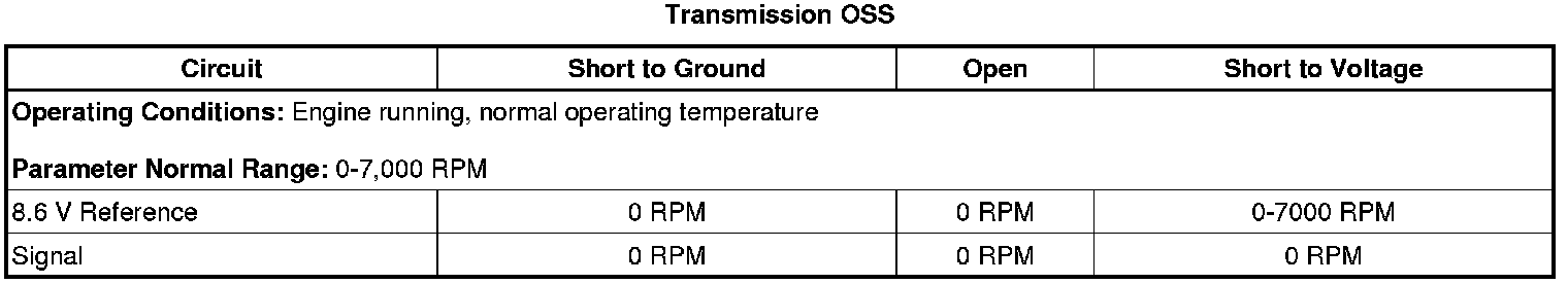 The automatic transmission output shaft speed (OSS) sensor is a hall-effect type sensor. The sensor faces the front differential transfer drive gear. The sensor receives 8.3-9.3 volts on the OSS sensor supply voltage circuit from the transmission control module (TCM). As the output shaft rotates, the sensor produces a signal frequency based on the machined surface of the output shaft. This signal is transmitted through the OSS sensor signal circuit to the TCM. The TCM uses the OSS sensor signal to calculate output shaft speed to determine commanded line pressure, transmission shift patterns, torque converter clutch (TCC) slip speed and gear ratio.