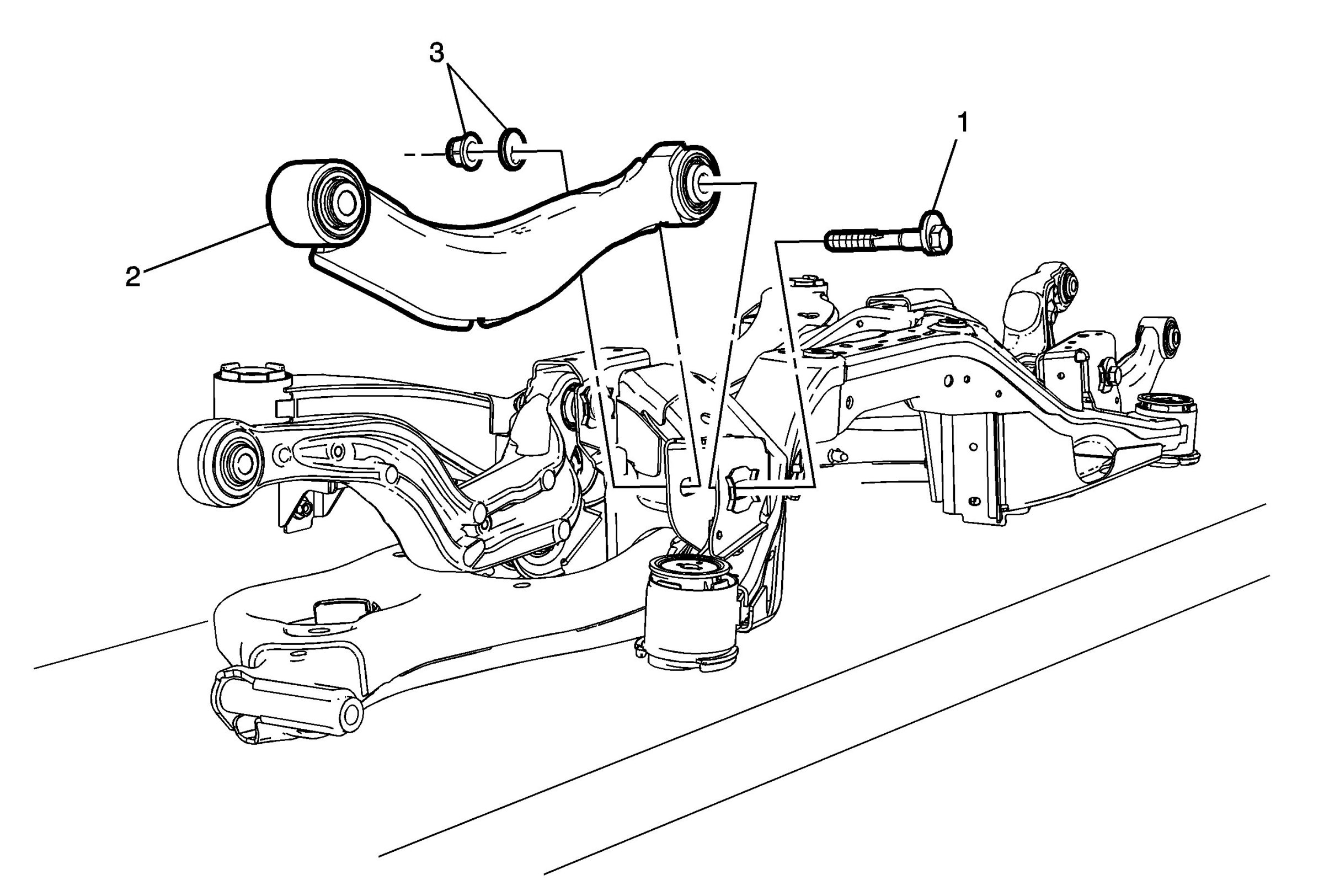 Remove the rear suspension upper control arm nut and washer (3).