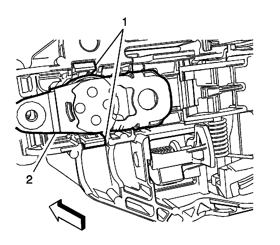 2. Install the door lock cylinder (2) in the front side door outside handle bracket, push forward locking the lock cylinder (2) into the lock cylinder retainer.