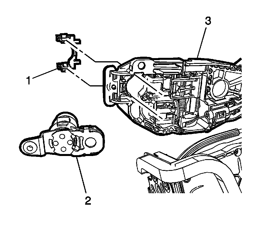 4. With the lock cylinder retainer (1) removed pull the lock cylinder (2) rearward releasing it from the handle bracket (3).