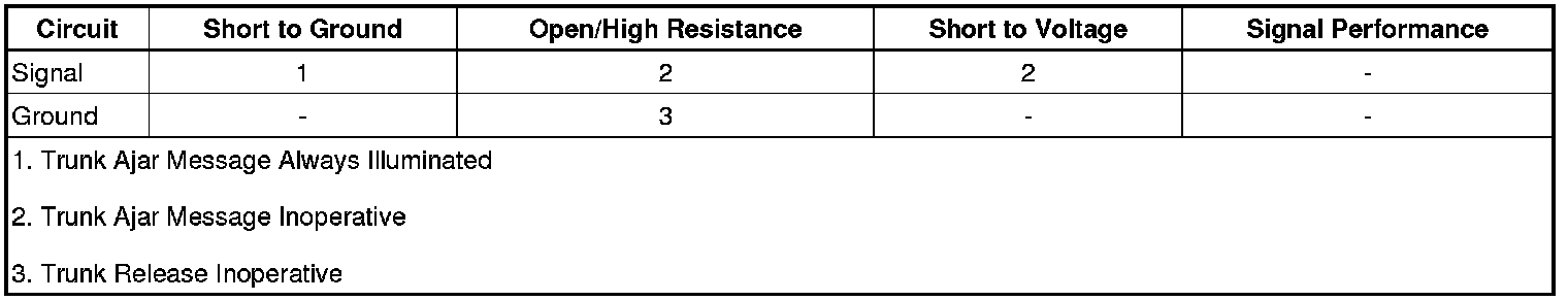 The Body Control Module (BCM) supplies a 12 V signal to the rear compartment lid ajar switch signal circuit. When the rear compartment lid latch releases the rear compartment lid, the rear compartment lid ajar switch, which is internal to the rear compartment lid latch, is supplied with ground which causes the trunk ajar switch signal circuit to be pulled low. The BCM interprets this and communicates via serial data to the driver information center which will display the Trunk Open message.