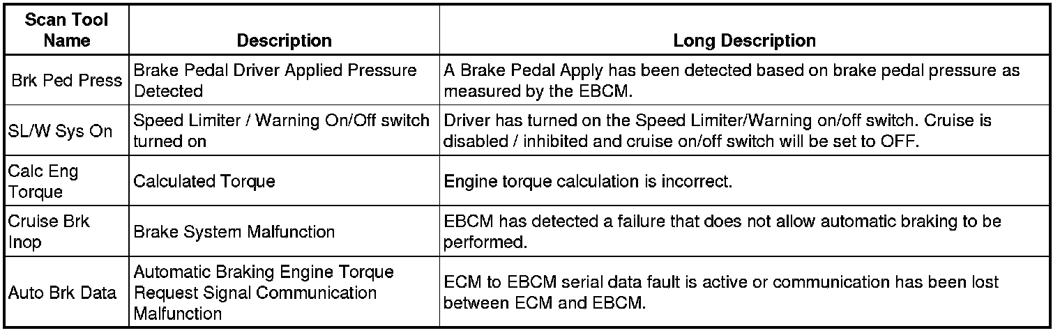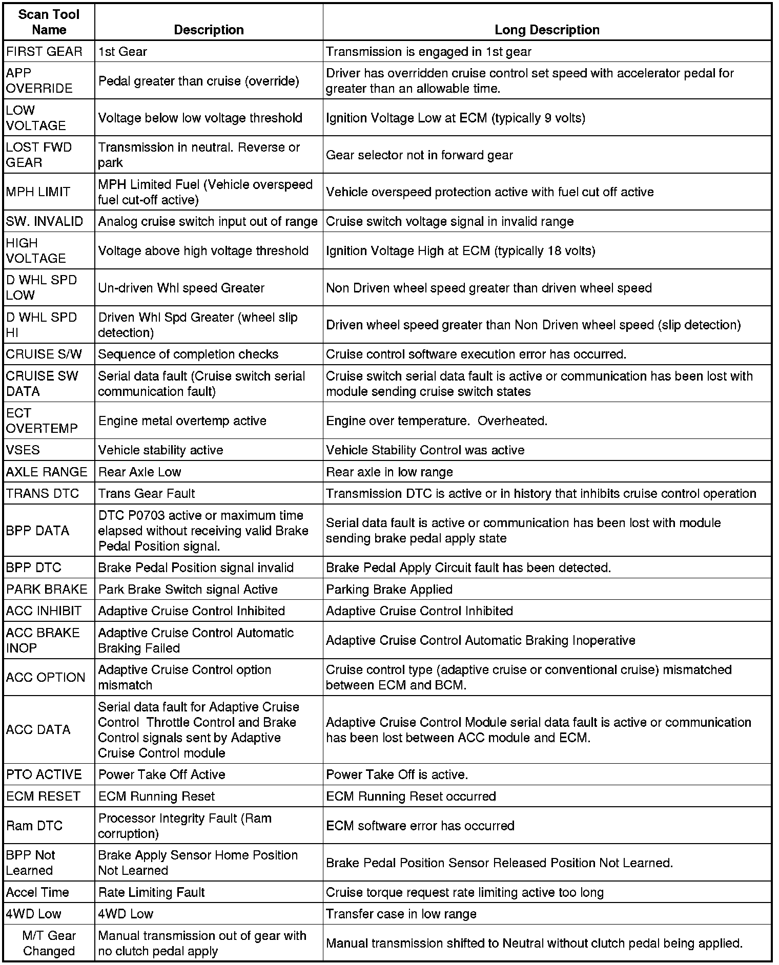 Every time the Cruise Control System is disengaged, the ECM will keep track of the reason for system disengagement. The last 8 disengagement reasons will be recorded within the ECM memory. The scan tool will display the last 8 Cruise Disengage History parameters, in which one out of approximately 50 possible reasons will be displayed in each of these 8 parameters. For the disengagement reason to be displayed within the scan tool parameter the Cruise Control System is active and disengagement is requested.