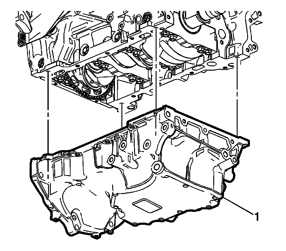 4. Position the oil pan (1) onto the block.
